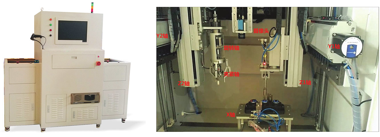 机器共有七个轴:除X/Y1/Z1/Y2/Z2五轴外,还有旋转轴U、夹紧轴J;另有1个按键气缸、1个按压力传感器、1个扭矩传感器。