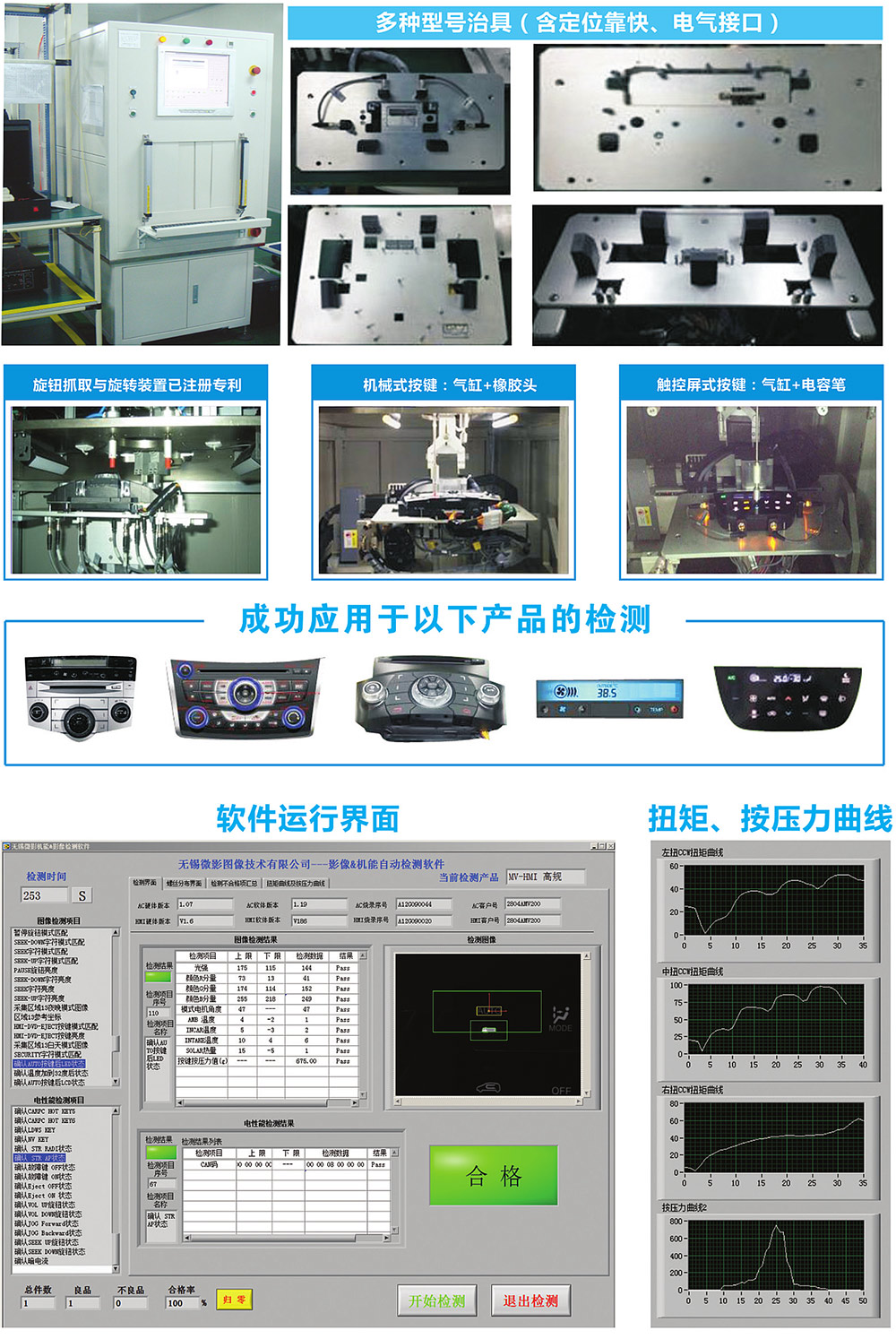 除上料、下料为手动外,整个检测过程全部实现自动化。核心部件全部采用国内或国际知名品牌,如:研祥工控机及触摸屏,美国NI的图像卡及其他测量板卡,日本SONY CCD摄像机,日本三菱伺服系统,日本OMRON安全光幕,台湾润达电移台.